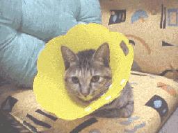 ![]() 撮影日:2000.02.16 抜糸のために病院に行く直前。 エリザベスカラーとも今日でお別れ。 「またどこかに連れていかれるの?」 |