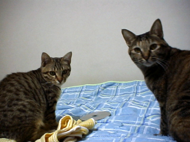 | <近況> 毒性の強いものを飲み込んで?1月31日から入院していたまめ太が 2月13日に無事退院しました。 みなさま、励ましのお言葉、ありがとうございました。 一時はどうなることかとヒヤヒヤしましたが、小さな体でがんばって 回復することができました。いや〜よかったよかった。(涙) 初日はりすにゃんとも感動の再会?を果たし、ベタベタしてたのですが、 日に日にまめ太は悪ぼうずに戻り、すでにりすにゃんは 「やっぱりうるせー」と思ってるみたいです。 深夜の追っかけっこはやめてくれー・・・ でも気がつくとりすにゃんはまめ太をペロペロ舐めてあげてます。 仲がいいんだか悪いんだか・・・・・。 そうそう、最近、見分けがつかなくなってきました。(^-^; |